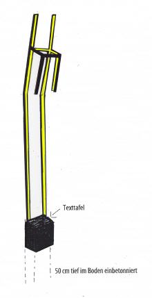 Als Denkzeichen für die Opfer des NS Regimes, die durch ihre Abstammung als „unwertes Leben“ deklariert und deshalb verfolgt vertrieben und bestialisch ermordet wurden haben wir die Skulptur "der Gebeugte Leere Stuhl“ konzipiert Eine darin integrierte Schrifttafel dient zur Informationsvermittlung. Ein zweites Schild mit einem QR Code verweist auf eine zugeordnete digitale Datenbank.