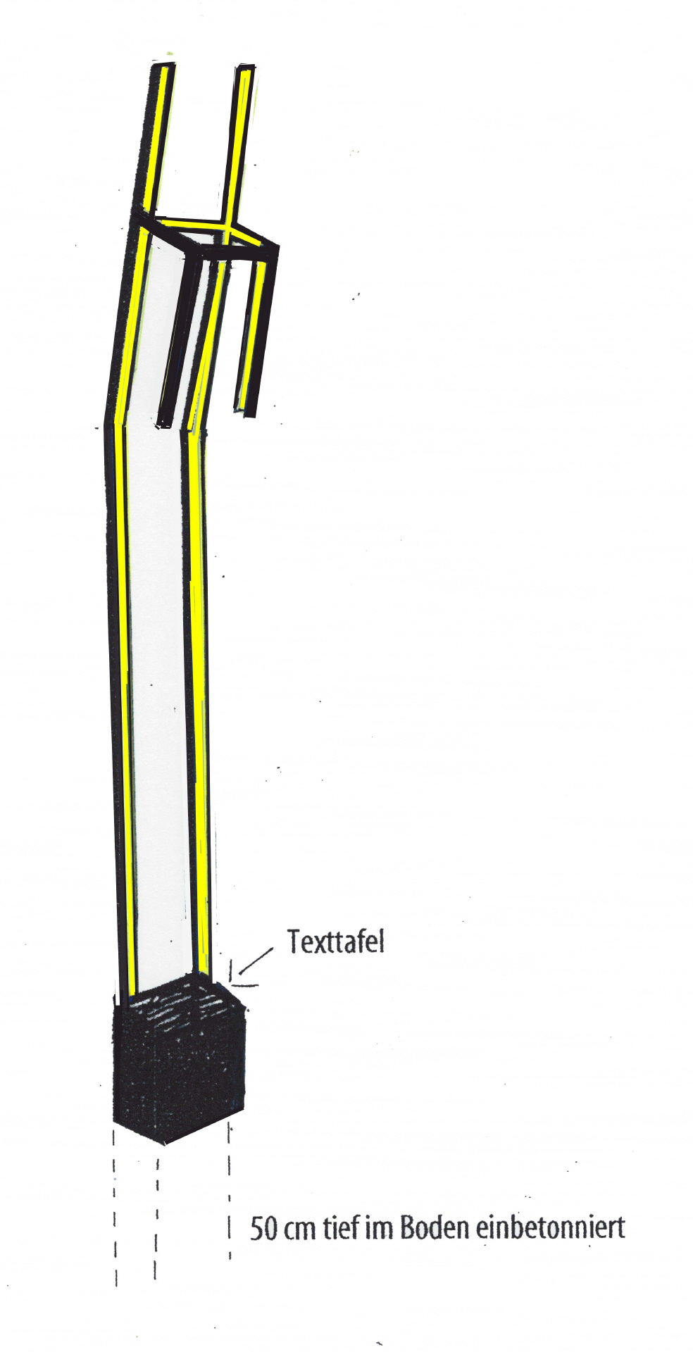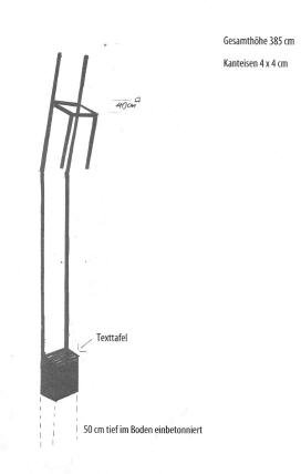 Als Denkzeichen für die Opfer des NS Regimes, die durch ihre Abstammung als „unwertes Leben“ deklariert und deshalb verfolgt vertrieben und bestialisch ermordet wurden haben wir die Skulptur "der Gebeugte Leere Stuhl“ konzipiert Eine darin integrierte Schrifttafel dient zur Informationsvermittlung. Ein zweites Schild mit einem QR Code verweist auf eine zugeordnete digitale Datenbank.