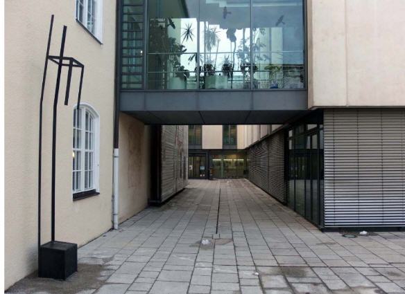 Die filigrane Skulptur vermittelt durch ihre unaufdringliche Irritation - die Verfremdung eines vertrauten Gegenstands (Stuhl) - die fragile Existenz der Opfer. Sie besteht aus einem leicht nach vorne gekippten Stuhlobjekt auf verlängerten Füßen, Gesamthöhe ca 4,50 - 8 Meter passend zum Standort, dessen Sitzfläche fehlt. Die Schieflage der einstigen - nun mehr leeren - Sitzfläche symbolisiert die Vertreibung bzw. Vernichtung der Opfer, deren Platz danach leer blieb.